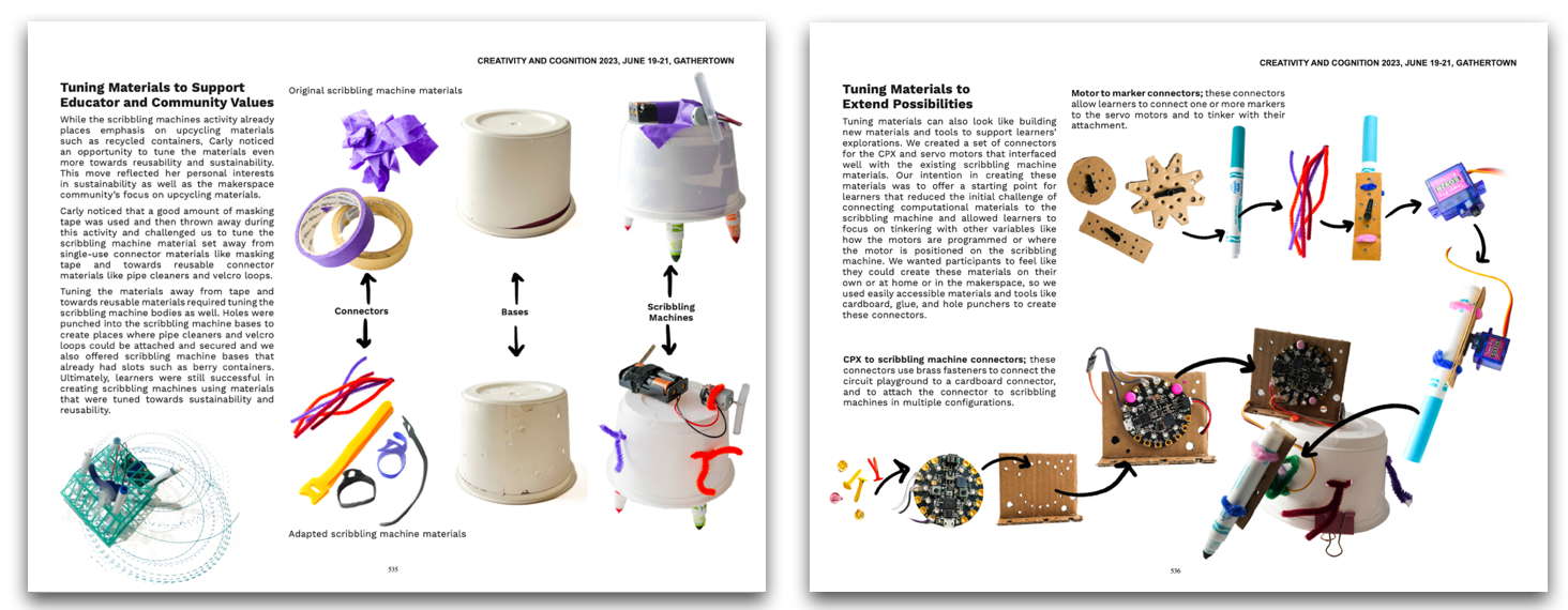 Two pages from our pictorial documenting the often unseen but instrumental “tuning practices” of making and tinkering educators to adapt a computational tinkering activity into their specific context to make it meaningful to their youth and families (Moreno & Roque, 2023)