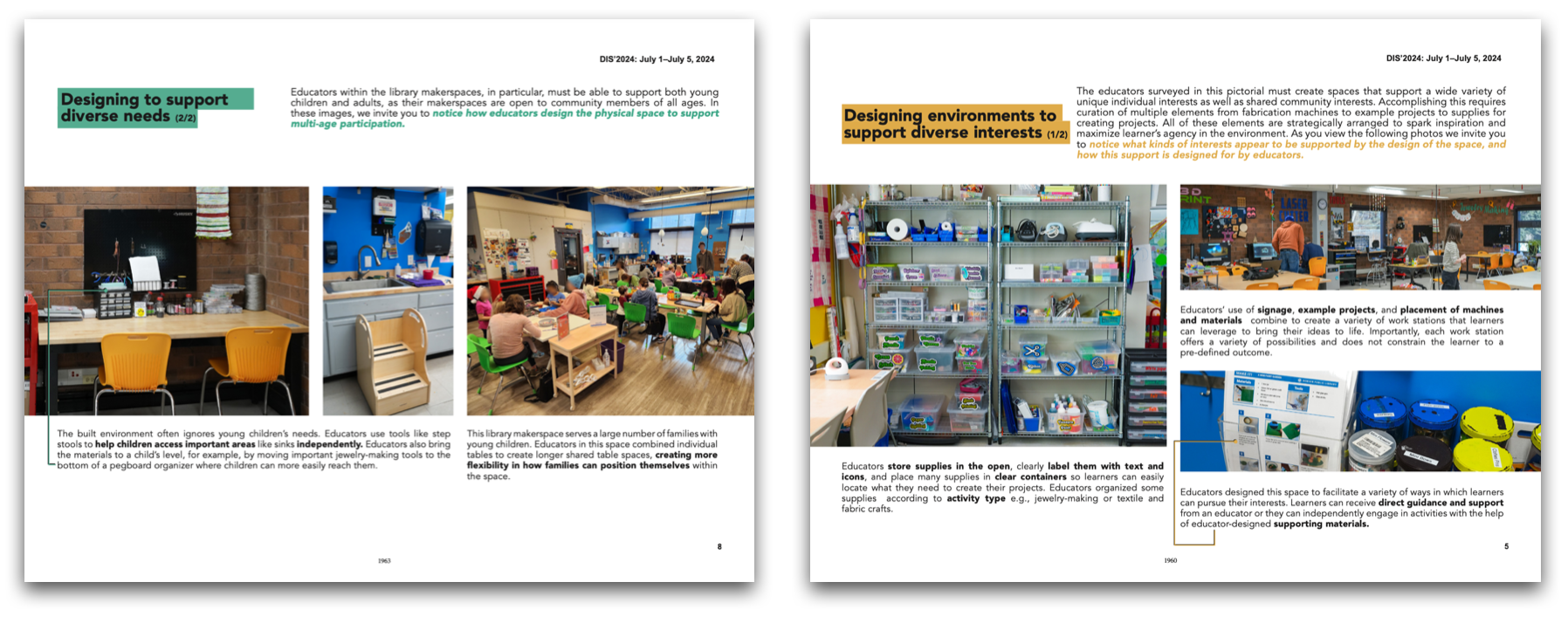 Two pages from our pictorial featuring a photo voice with educators in making and tinkering spaces. We highlight how educators are designers intentionally arranging and curating their spaces to meet the needs and interests of their learners (Moreno, Shalf, Roque, 2024)